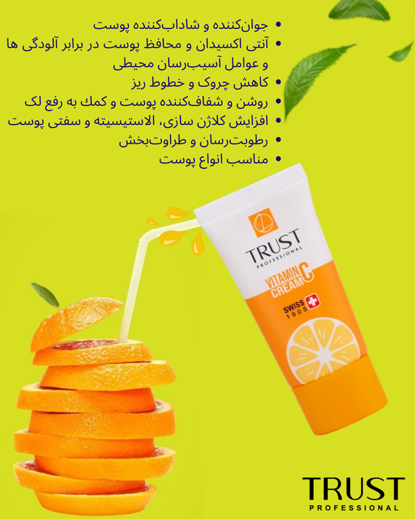 🍊درست است که پرتقال سرشار از ویتامین سی است، ولی هرچقدر هم از آن استفاده کنید، باز جای محصولات حاوی ویتامین سی را برای پوستتان نمیگیرد. اگر روی پوستتان لکهای ناشی از آکنه و کک و مک دارید، اگر به مدت طولانی در معرض نور خورشید بودهاید و پوستتان تیره شده است، اگر نیازمند یک آنتیاکسیدان قوی برای پوست خود هستید، کرم ویتامین سی تراست یک گزینه بسیار عالی برای شماست.
